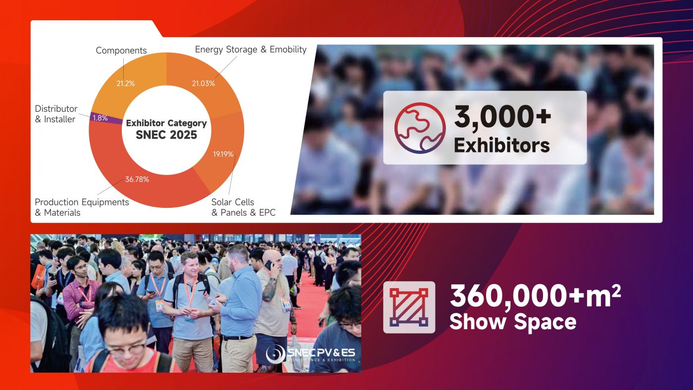 Die Messegröße des SNEC hat sich von 15.000 m² im Jahr 2007 auf über 360.000 m² im Jahr 2025 weiterentwickelt, als über 3.000 ausstellende Unternehmen aus 95 Ländern und Regionen weltweit anzogen und der Anteil der Aussteller im Ausland über 30 % beträgt. Die SNEC ist zur größten internationalen PV-Messe mit unvergleichlichem Einfluss in China, Asien und sogar weltweit geworden.